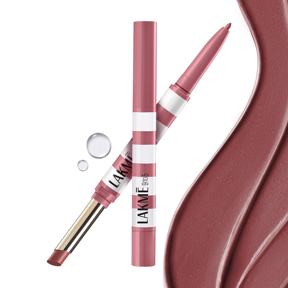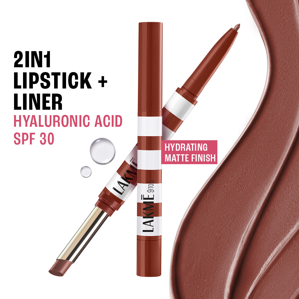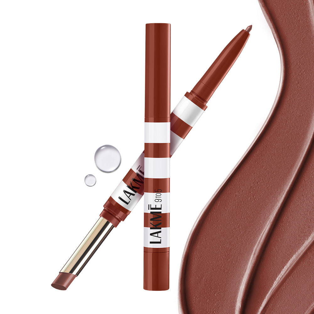 "Simplify your lip routine with the new Lakmē 9to5 Hya Beach Edit Lip Duo – the ultimate essential for fuller, softer, and beautifully defined lips. This 2-in-1 genius combines a precise lip liner and a rich, hydrating lipstick to give you everything you need to add vibrant colour to your look. Packed with rich pigments, it delivers a comfortable matte finish that’s bold, stunning and feels as good as it looks. The lipstick is infused with Jojoba Oil, Hyaluronic Acid, Vitamin E, and SPF30 to keep lips moisturized, plump, and protected from UV damage. A makeup and skincare hybrid that goes beyond! The dual-action applicators make it effortless to sculpt, fill, and perfect your pout. Say goodbye to carrying multiple products, this lip duo is all you need for a picture-perfect pucker. It gives you endless ways to play with your look – whether you want sharp lines, gradient finishes, contoured lips, or a fuller-lip effect, this duo has you covered! Its easy-glide formula delivers full coverage in one swipe and does not bleed or flake throughout the day! The Beach Edit Lip Duo comes in 10 shades designed Indian skin tones. One product, infinite fun – your summer just got a whole lot more colourful!"
