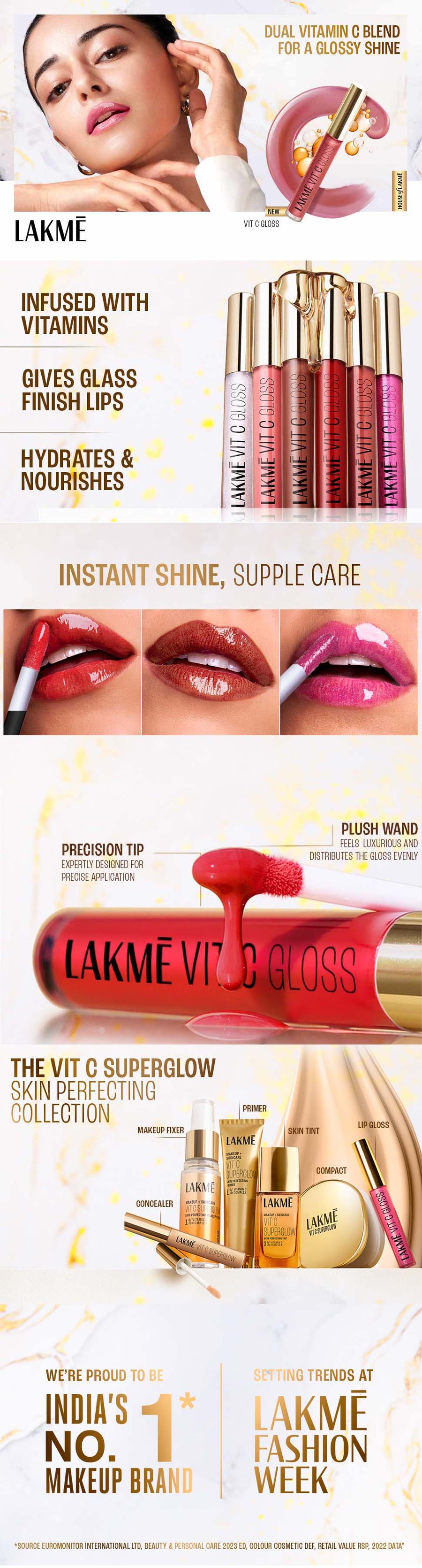 "Experience the power of Vit C! Introducing Lakmē Vit C Lip Gloss, a burst of vitamins for your lips. Packed with dual blend of Vitamin C and the added benefits of Vitamin E, a moisture-rich formula that leaves your pout plump, nourished and lustrous. Our stunning collection of six irresistible shades offer everything from bold, vibrant hues to subtle tones that deliver intensely rich pigment. It doesn't just give a glossy finish, but hydrates and nourishes, giving a fuller lip look on the go. Vitamin C is known for its antioxidant properties, which brightens and reduces oxidative stress. Vitamin E soothes inflammation, leaving your lips supple and soft. Say goodbye to dry, dull lips and hello to glossy lips with a formula that’s pigmented, light and comfortable on the lips, with dual Vit C hydration. Get ready to shine with a glimmering glass finish and a perfectly plump pout. 100% of consumers felt soft, smooth, and supple lips post application while 96% confirmed diminished appearance of fine lines. Tuck your favorite Lakmē Vit C Lip Gloss shade into your handbag and keep your pout glam and nourished. Discover new confidence and elevate your beauty regime with the Vit C range."